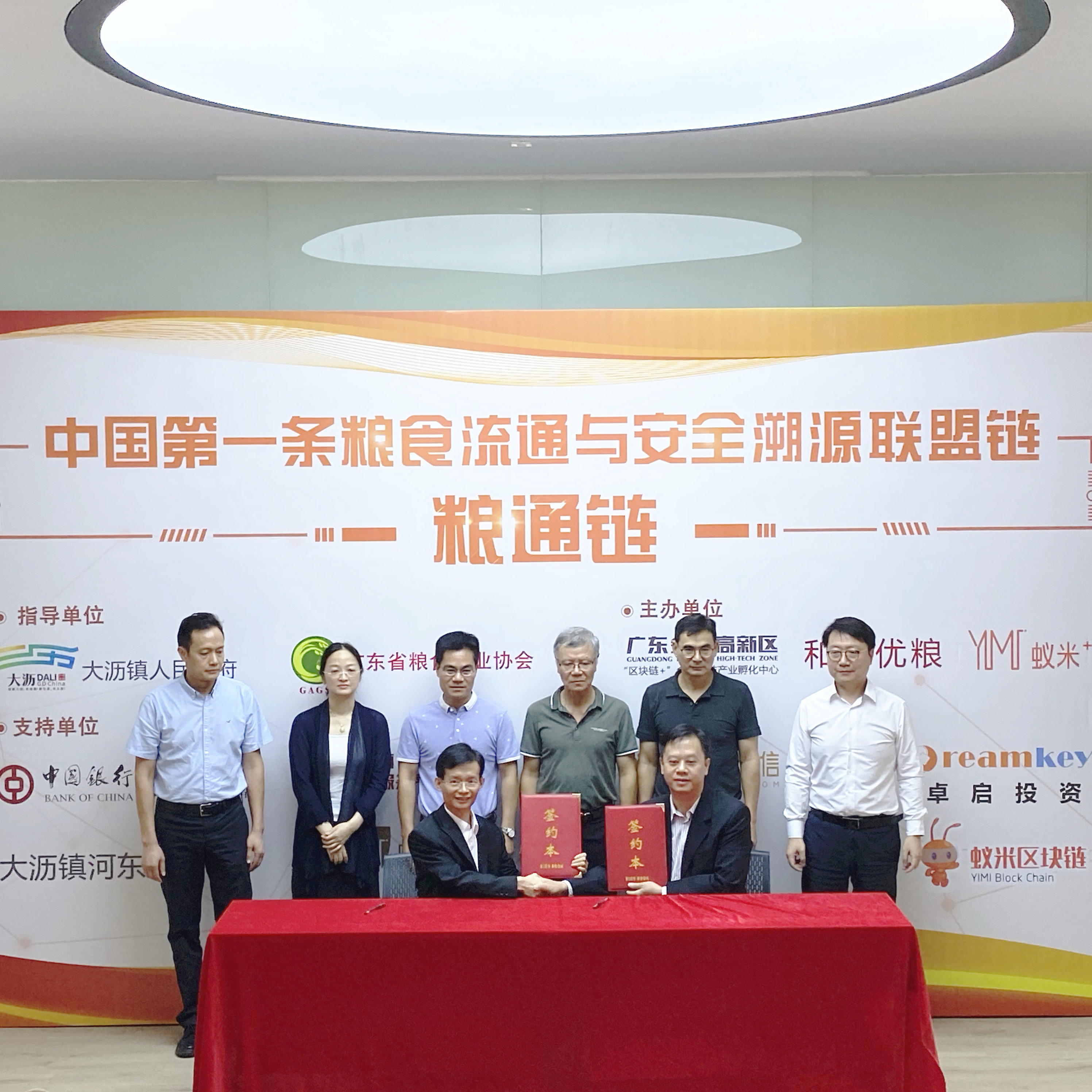 以2019年10月14号国务院发布的《中国粮食安全白皮书》为指导思想,10月23日在广东金融高新区“区块链+”金融科技产业孵化中心正式发布,蚁米与广东省和一优粮供应链管理有限公司联手打造中国第一条粮食流通与安全溯源联盟链——粮通链。