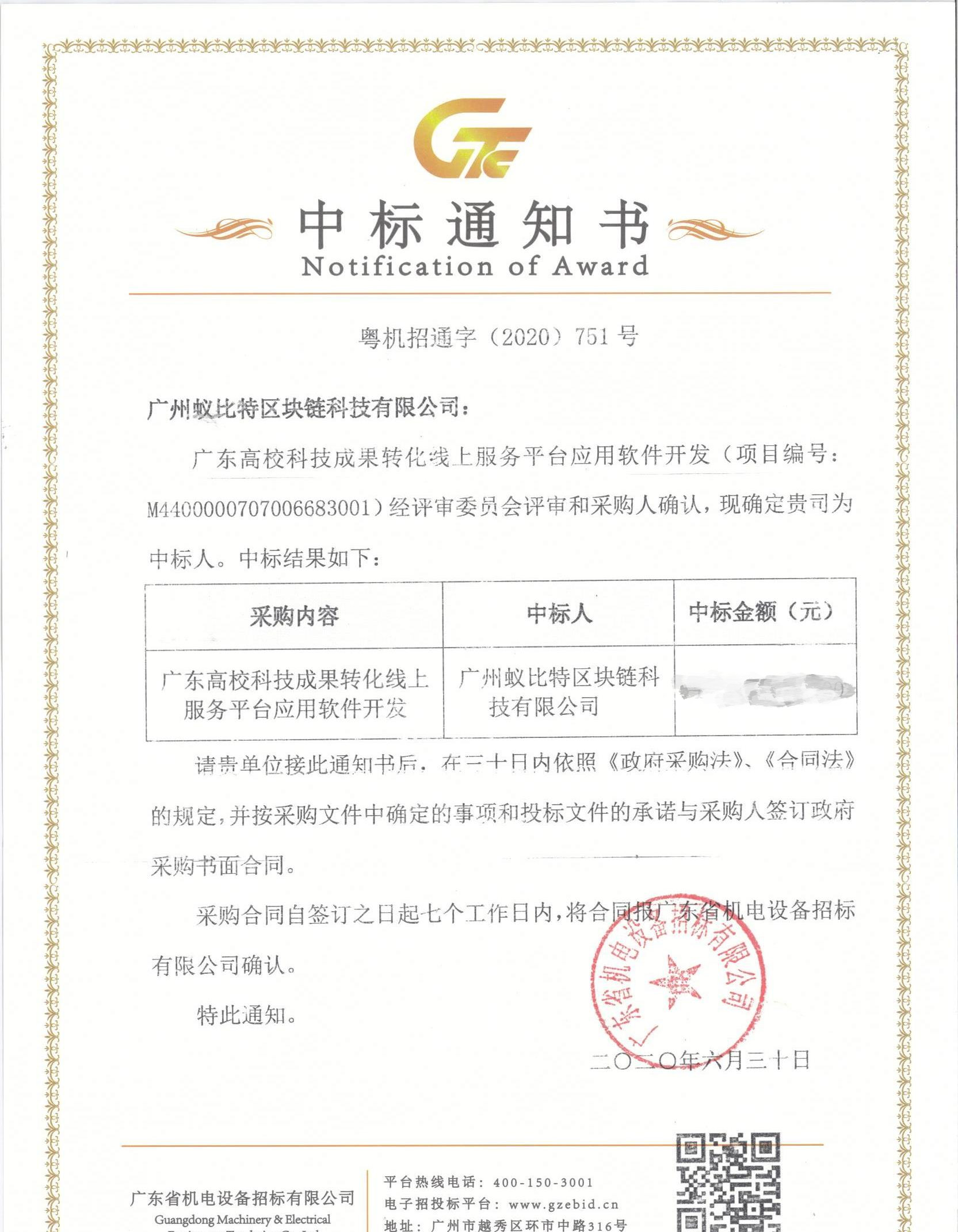 7月1日,蚁米旗下广州蚁比特区块链科技有限公司中标重大省级项目--广东高校成果转化线上服务平台。