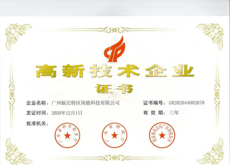 2020年12月1日,蚁米卓启旗下广州蚁比特区块链科技有限公司通过国家高新技术企业认定。